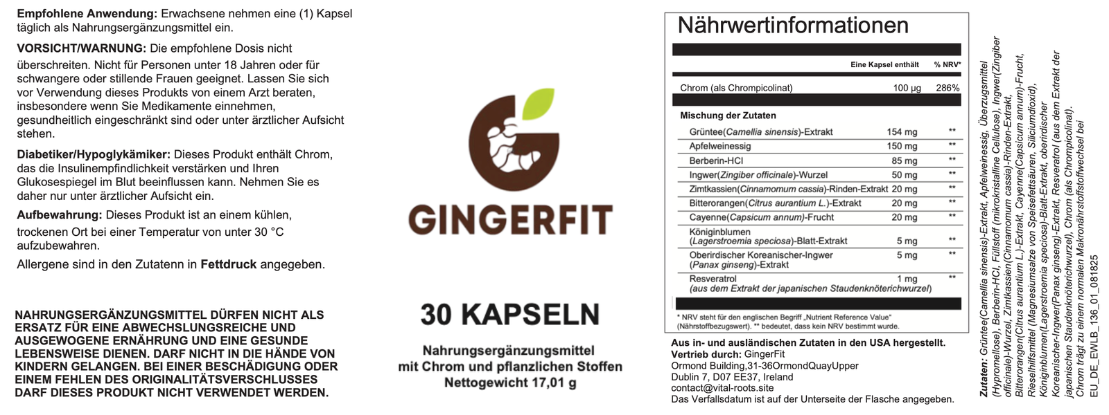 GingerFit ist Ihr smarter Helfer für natürliches Gewichtsmanagement: nur 1 Kapsel morgens, 5 Minuten vor dem Frühstück, und die Formel aus Ingwer, Grüntee, Apfelessig, Berberin, Cayenne, Bitterorange, Chrom u.v.m. unterstützt Thermogenese, Fettverbrennung und ein länger anhaltendes Sättigungsgefühl.